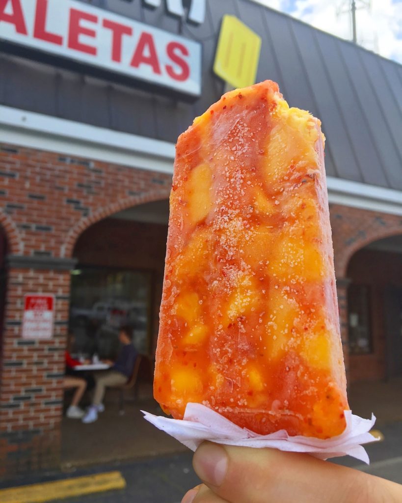 The combination of spicy chili and sweet tropical fruits that's absolutely wonderful, and it gets addictive quickly. La Michoacana is open year round.