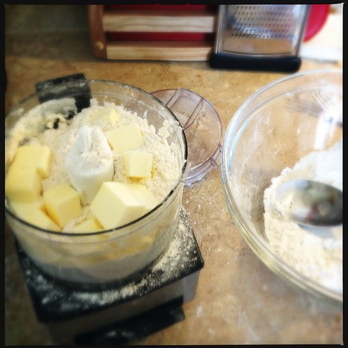 3. Put the dry ingredients and butter into a food processor with a blade attachment. If you don't have a food processor, you can do this part by hand. If you've got one, but it's laughably tiny like mine is, do it in batches.