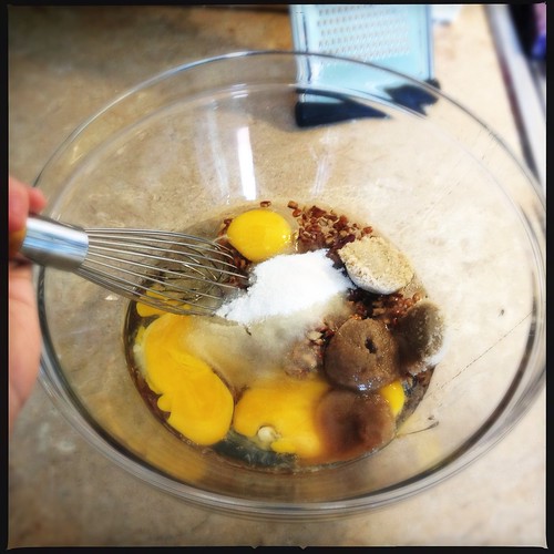 1. Combine the chopped pecans, corn syrup, eggs, sugars, salt, vanilla and bourbon in a large bowl and whisk together. Melt the butter and temper into your mixture.