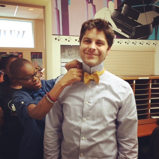 Mo helps Kevin "look good and feel good" with this snazzy yellow bow tie. See a video of Mo tying the bow here.