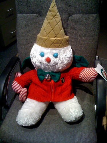 Mr. Bingle appeared in window displays, advertisements and puppet shows at the stores. He also had a theme song and was sold as a stuffed animal and figurine. Take a good look at him. He's got almost none of the traditional snowman parts - there's no carrot nose, and the coal eyes have been replaced by slightly creepy and vacant blue orbs. He's wearing what appears to be an upside down ice cream cone. He also has two holly leaves coming out of his back like wings.