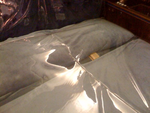You'll notice that that's one shiny bed. Before you get the idea that Elvis and your grandma have similar furniture covering tastes, know that the plastic is there to preserve the upholstery through millions of tours.