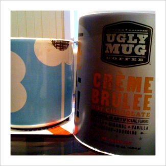 I picked up this canister of Ugly Mug's Creme Brulee Hot Chocolate at Schnucks yesterday. I made the first cup this morning, and I think I may have a new favorite drink. It's warm and vanilla-y and caramel-y, and totally made in Memphis. Yum.