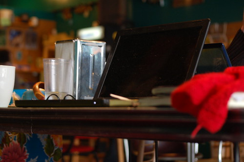 I'm up at Otherlands this afternoon, working on a few things while I wait for the winner of the Wish gift certificate to meet me. I managed to snag one of the bigger (but not too big) tables next to an outlet, and I've got my work flotsam and jetsam sprawled out all over it.