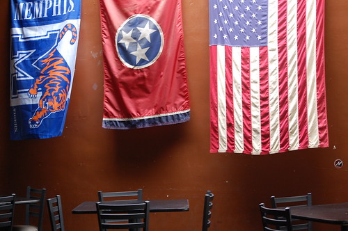 The Hi-Tone Trifecta: a Memphis Tigers flag, a Tennessee Flag, and the US Flag.