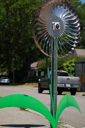 Several of these giant metal flowers were standing outside of metalworker Yvonne Bobo's studio on Young Ave. yesterday afternoon. When she's finished, about 30 of them will be placed at the new building at LeBonheur Children's Hospital.