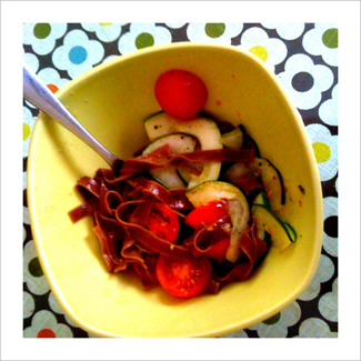 When I opened the package, it smelled like cocoa powder. Not sweet, just kind of dry and chocolatey. The pasta cooks up quickly - it only took about three minutes. For a topping, I followed the pasta chef's advice and sauteed some cucumbers and tomatoes in olive oil.