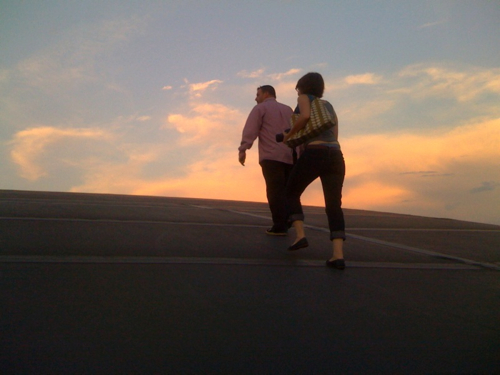 Michael, who works at the arena, offered to take me up on the gray domed roof at sunset, and I wasn't about to turn that down.