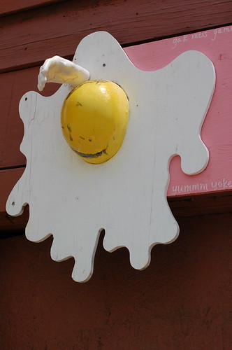 This egg and hand sculpture showed up on an empty building around the corner from my house sometime in the last week or so. It's accompanied by some flat panels in the shape of whales and rectangles that say "gak" all over them.