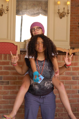 There's a real community spirit among the girls. While I was talking to 11 year old Zoe Elliotte and her friend Nykkoa, their bandmates gathered around, giggling and sitting on each others' laps. Having declared today "Hobo Day', Zoe was dressed in plaid shorts, a homemade t-shirt, a knit cap, duct taped flip flops and one ripped blue glove. I asked her if it was Hobo Day for everyone, and her response was very rock'n'roll: "No, but it should be."