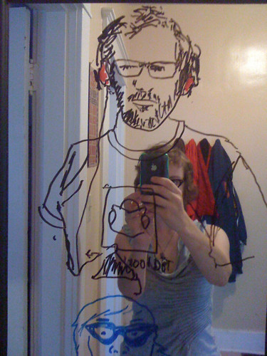 I came home this afternoon to find that Matthew had drawn a little self portrait on the hallway mirror. I tried to do one underneath it, but it didn't turn out as well. It's hard to trace your own reflection.