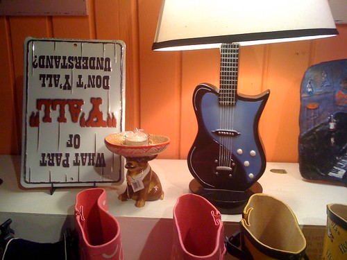 (Note especially the upside-down sign and ceramic dog with a handlebar mustache.)