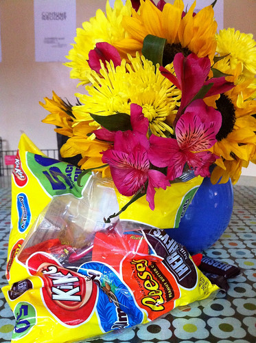 Fall flowers and left over Halloween candy on my dining room table. We didn't have many trick or treaters, so all of those KitKats are mine.