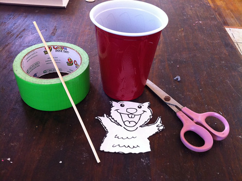 You need: tape, a cup, a skewer or straw, some scissors (or other sharp object), and the groundhog picture of your choice.