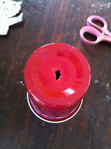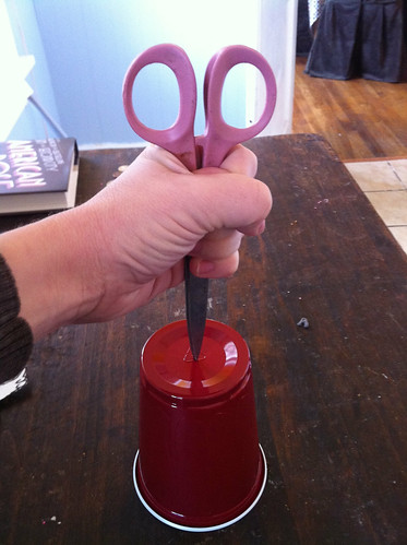 Use your sharp object (scissors, knife, whatever) to poke a small hole in the bottom of the cup. It doesn't have to be pretty. You're going for something like this: