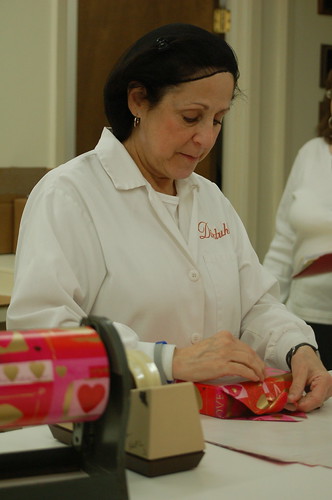 Judy Moss, photographed packaging chocolate at Dinstuhl's Fine Candies, where she's one of the owners.