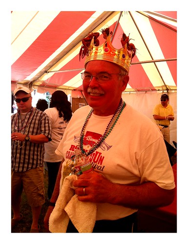 Mike Warr, the self-proclaimed King of Crawfish, in the judges' tent at Rajun' Cajun' Crawfish Festival. (Yes, the crawfish impaled on his crown are real.)