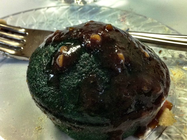 My low score of the day went to a corn-based barbecue cupcake that looked like a Ninja Turtle hockey puck. I'm not sure why it was green, and I didn't really want to find out. There was no icing, but it came to the table with a little tub of barbecue sauce glaze.