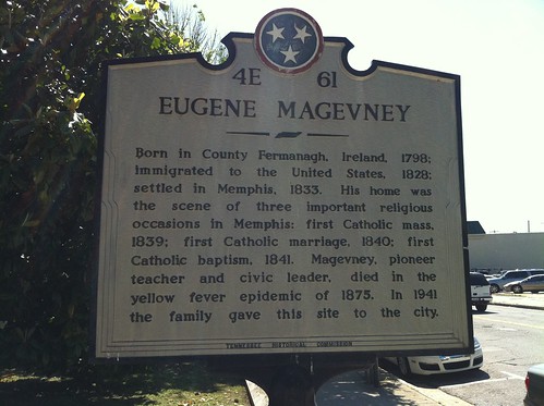 "Born in County Fermanagh, Ireland, 1878; immigrated to the United States, 1828; settled in Memphis, 19833. His home was the scene of three important religious occasions in Memphis: the first Catholic mass, 1839; the first Catholic marriage, 1940, first Catholic baptism, 1941. Magevney, pioneer, teacher and civic leader, dies in the yellow fever epidemic of 1875. In 1941, the family gave this site to the city."