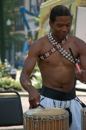 Adrian Couch has been an African dancer for more than 21 years. He's also a member of a djembe ensemble and the New Ballet School and Ensemble. This is him with one of his drums during a Downtown Alive performance in Court Square.