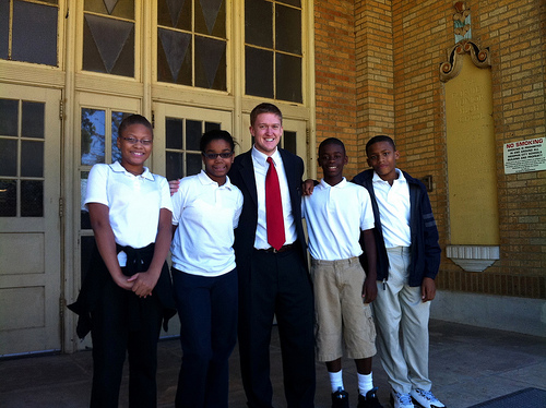 Tom Millett is originally from Boston, but he moved to Memphis two years ago to teach sixth grade math at Fairview. He's with his former students, seventh graders Antoinette H., Jasmine B., Desten P., and Ronnie J. They're all part of Fairview's Middle College High School program. That means that once they get to ninth grade, they start taking classes at Christian Brothers University. If they take all of the available college classes, they'll graduate high school with enough credits to start college as sophomores.