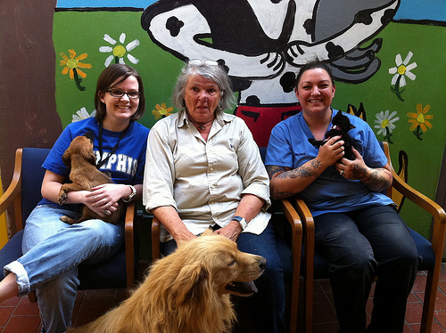 Memphis Animal Shelter volunteers and employees Heather Guess, Jeanne Chancellor and Melissa Wade pose with some of the shelter's adoptable residents (including giant golden retriever Simba).