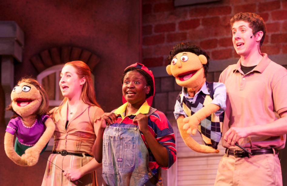 "Avenue Q". is a musical that stars a mix of puppets and live humans who all live on the same New York City street, Avenue Q. They sing, they dance, they teach lessons. There are even Sesame Street style video breaks that feature lessons in letters and numbers.