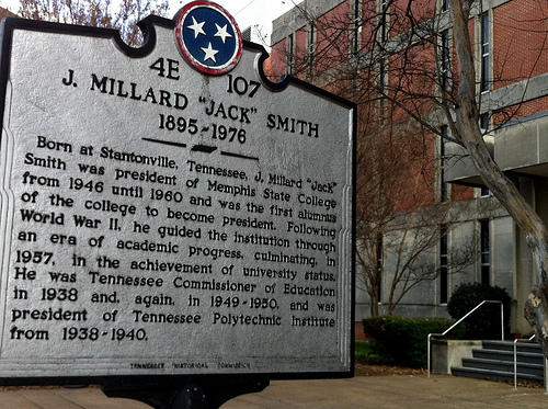 "Born at Stantonville, Tennessee, J. Millard "Jack" Smith was the president of Memphis State College from 1946 until 1960 and was the first alumnus of the college to become president. Following World War II, he guided the institution through an era of academic progress, culminating in 1957 in the achievement of university status. He was Tennessee Commissioner of Education in 1938 and, again, in 1949-1950, and was president of Tennessee Polytechnic Institute from 1938 - 1940."
