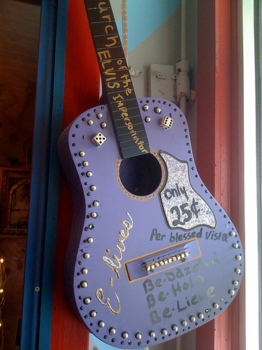 The shrine lives in a corner near the counter at Goner Records. Its pink interior is loaded with tchotchkes (some of which have nothing to do with Elvis). It's lit from above by the primary colored light of a disco ball and the hand-painted King of Rock'n'Roll is outlined in twinkle lights.