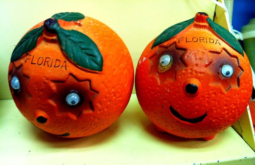 Someone went to Florida and returned with these googly-eyed orange salt and pepper shakers. What you can't see is the larger matching sugar bowl.