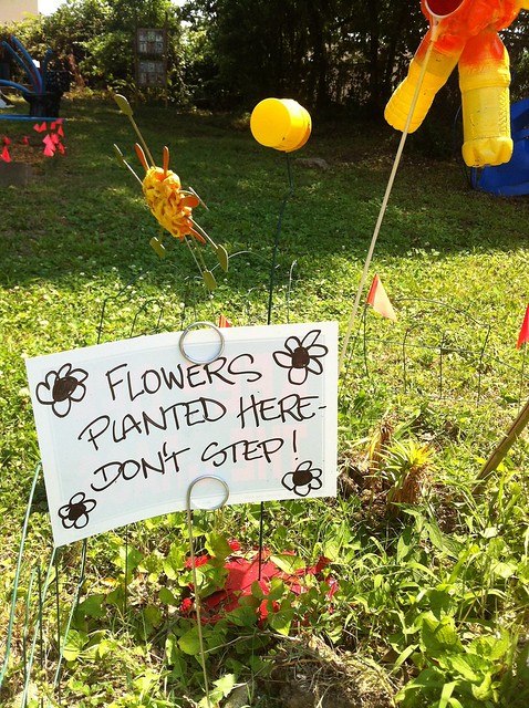 Once you're on the right street, the garden is easy to find - it fills an empty lot on a quiet street lined with older bungalows. It's got benches, sculptures, a no adults allowed painting wall, a fledgling garden and a hook-shaped stone path.