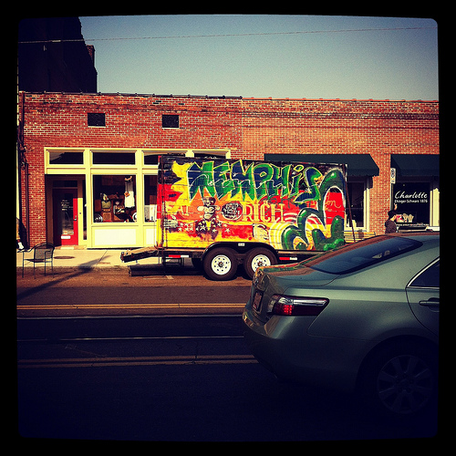 This trailer was parked on South Main during trolley tour last Friday night. On one side, there's an American flag that the trailer's owner encourages people to write on. On the other side, there's this: a mural devoted to the concept of "Memphis rich". I'm not entirely sure what that means, but I do know this - Memphis rich is way not the same as New York rich.