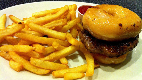 The donut buger is exactly what it sounds like - a naked hamburger patty sandwiched between two glazed donuts instead of a bun. It sounds a little gross (and it kind of is), but it's also a glorious combination of grease and sugar, the kind that can cure a hangover or a broken heart.