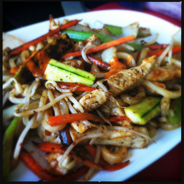 The stir fry comes with your choice of meat (chicken, steak, shrimp, calamari, etc.), your choice of noodle (soba, udon, etc.), and tons of fresh zucchini, celery, carrots, onions and bean sprouts.