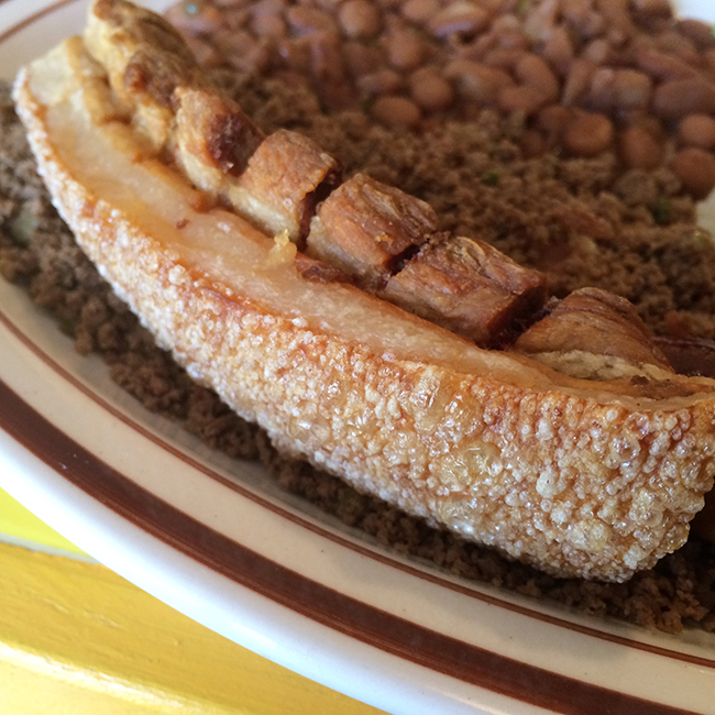 Ed. Note: I don’t know if it was the preparation or just a personal preference/the lack of pork rind experience Savannah and I have, but the pork rind didn’t do it for us. I was still curious, though, and did a little research to find that it was very similar to the “chicharrón” pork belly featured on this Colombian food blog. I’d love to know what you think, if you’re a big fan of pork, pork belly, or more experienced in Colombian food.