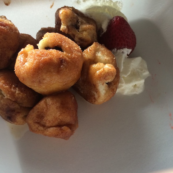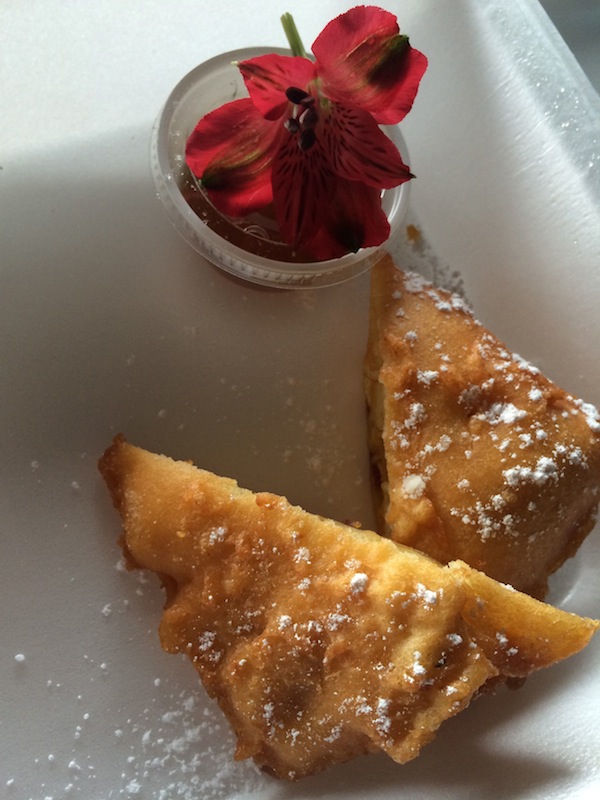 Sausage fried in funnel cake batter with maple syrup and a flower garnish, because why not?