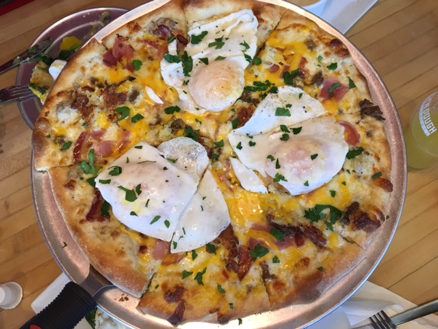 This thing was packed with protein: bacon, ham, and sausage gravy, plus three fried eggs and all that cheese and hashbrowns. Plus, that perfectly crispy RnD curst. After I'd eaten a slice or two, my dining companion and I both wondered how this pizza might be with a red sauce. It may have needed something a little tangy to balance it out...on the other hand, we might just be nitpicky.