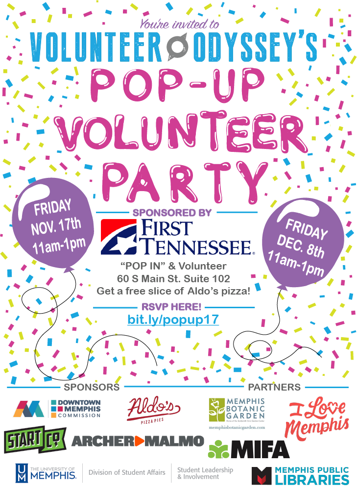 Go there: Volunteer Odyssey Pop-Up Parties 60 S. Main St. Suite 102 Memphis, Tennessee 38103 Nov. 17 and Dec. 8 2017 http://bit.ly/popup17