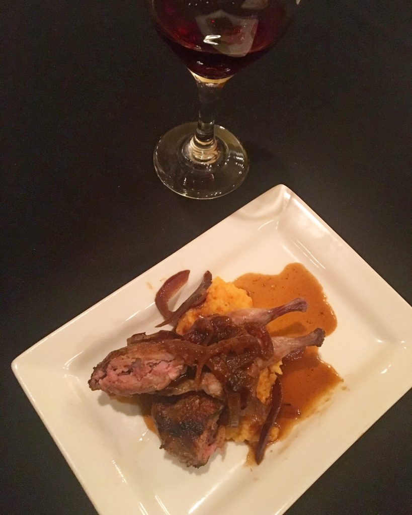 Next, we tried Bend Islands Pinot Noir with roasted quail, sweet potato grits, with a kind of delicious savory barbecue-related sauce.