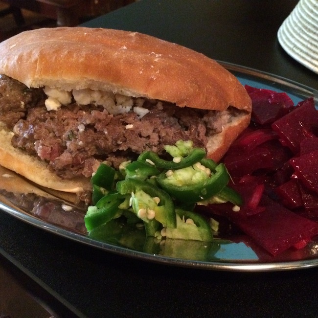 There are about a dozen tables, including a couple of big booths, as well as a bar. My friend ordered a traditional Ethiopian chickpea stew, shiro wat, with a tomato salad and a side of greens. I was curious, so I tried the lamb burger with a beet salad.