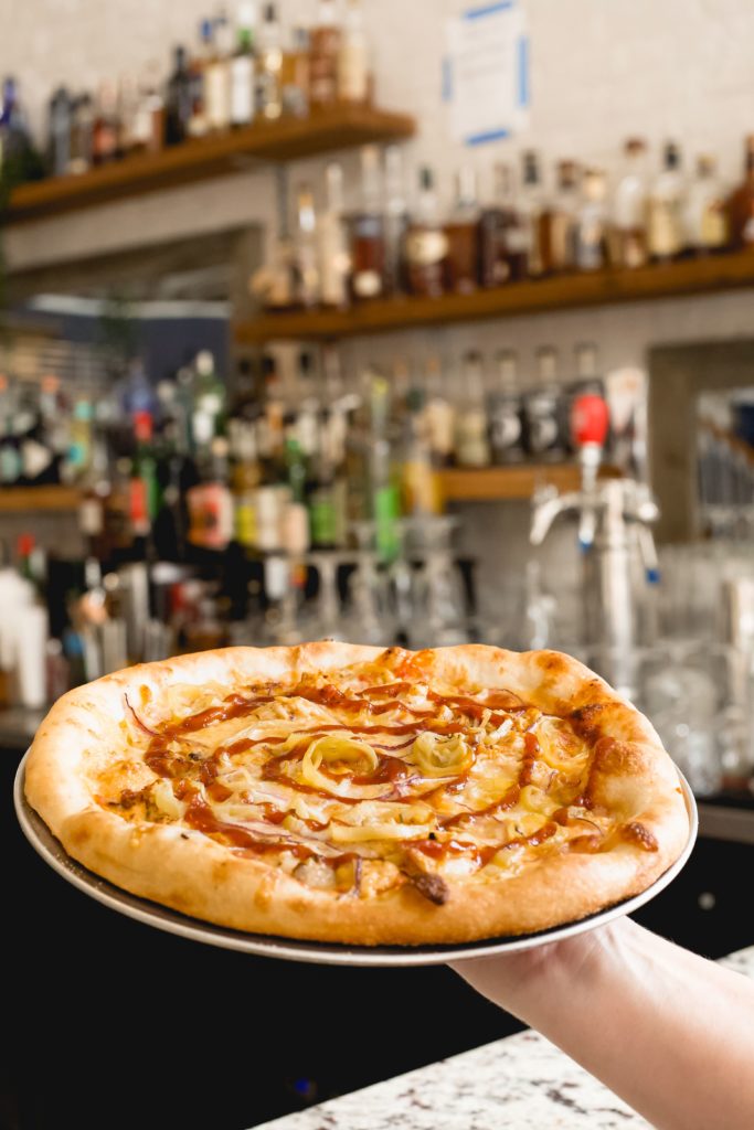 You'll get a slice of BBQ chicken pizza with a red sauce, cheddar, mozzarella, shaved red onion, and pepperoncini.