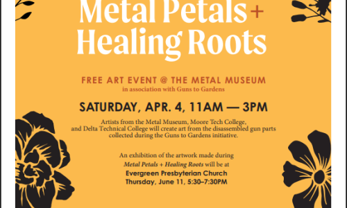 Come and see how the magic is made! Join us for this free art event at the Metal Museum of Memphis and watch the artists (from the Metal Museum, Moore Tech College, and Delta Technical College) shape the metal collected during Guns to Gardens.
