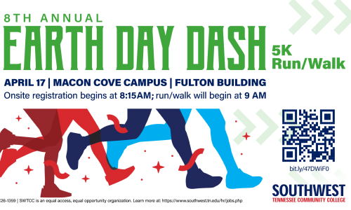 Southwest Tennessee Community College invites you to observe Earth Week with their 8th Annual Earth Day Dash 5K run/walk on the Macon Cove Campus on April 17, 2026. The event takes place near the Fulton Building located at the front of the campus.