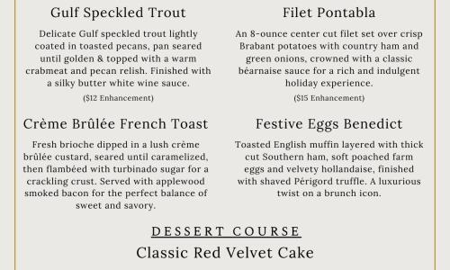 Celebrate Christmas Day at Paulette’s with a warm, elegant brunch overlooking the Mississippi River in Harbor Town, a three-course, prix fixe menu designed to feel festive, indulgent, and a little nostalgic, while still delivering the refined Southern hospitality Paulette’s is known for. This merry menu will be available from 10:00 a.m. to 3:00 p.m. on Christmas Day. The Price is $59 per person, with supplements for select entrées, and beverages priced separately. Price does not include tax or gratuity. A full bar, brunch cocktails, and a curated wine list will be available to complement your meal. Reservations are strongly encouraged and can be made via opentable.com.