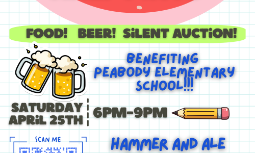 Peabody Elementary PTA is hosting their annual Half Pints for Half Pints fundraiser on April 25th. The event will be held at Hammer and Ale. Ticket will include access to beer, food, silent auction and dj.
