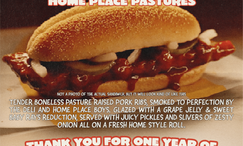 Come celebrate Hard Times Deli’s 1-year anniversary with the new McWib! In collaboration with Home Place Pastures, the Hard Times Deli & Home Place Pastures team will be slanging McWibs in the parking lot and inside while supplies last.