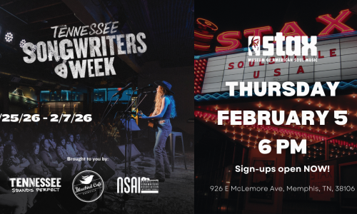 Tennessee Songwriters Week, an annual statewide celebration of the songwriters and the craft that shaped Tennessee’s rich musical history. The mission of Tennessee Songwriters Week is to support music venues, create live performance opportunities for songwriters, and inspire travelers to experience the state’s vibrant music stories.