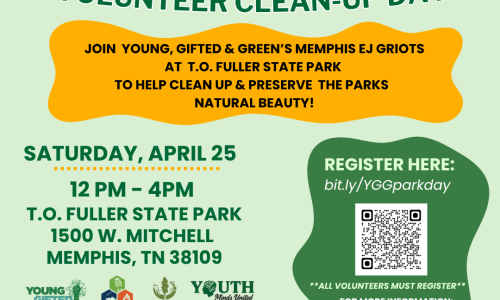 Join Young, Gifted & Green's Memphis EJ Griots at T.O. Fuller State Park to help clean-up and preserve the parks natural beauty. All volunteers will be provided with supplies and light refreshments. Volunteers must register at: https://tnstateparksvolunteer.galaxydigital.com/need/detail/?need_id=1194576
