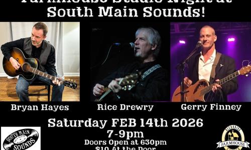Farmhouse Studio and South Main Sounds are excited to bring you this great Songwriters Night! Songwriters Bryan Hayes, Rice Drewry, and Gerry Finney will share the stage...alternating songs and stories! Tickets are $10 at the door and seating is limited...come join us for this very special Valentine's show!