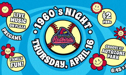 Turn back the clock with the Memphis Redbirds and "rock on" at this '60s-themed celebration filled with groovy vibes, classic hits, and retro fun at AutoZone Park!